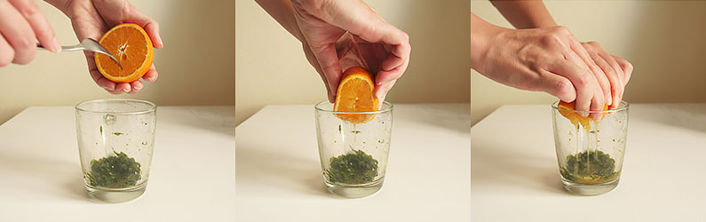 А лимон в коктейле можно смело заменить апельсином, получится интересный апельсиновый мохито: мяту растереть в стакане, выжать в нее половинку апельсина, добавить лед и спрайт.