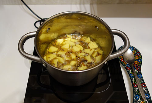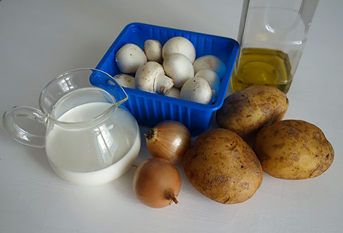 Картофель положить в воду, посолить и поставить вариться. Когда картофель будет готов добавить к нему обжаренные грибы с луком и продолжать варить еще 3-4 минуты. После чего добавить сливки и довести до кипения.