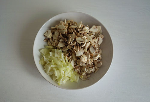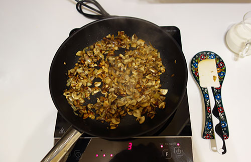 Грибы и лук обжарить с маслом на сковороде по появления румяного цвета. При жарке добавить молотый мускатный орех. При мелкой нарезке грибов на жарку уходит 5-7 минут.
